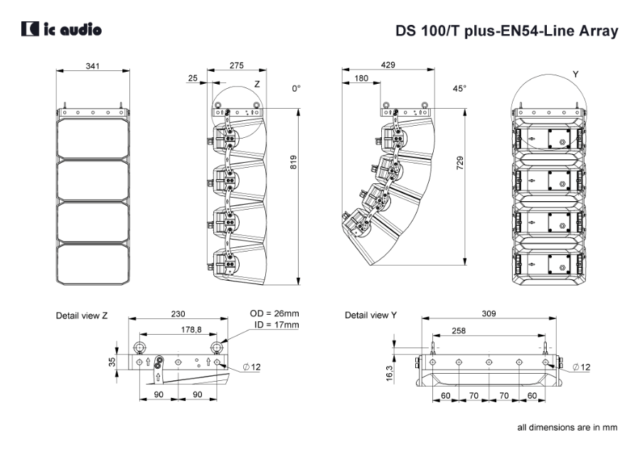 Das DS 100/T plus-EN54-Line Array bringt die Stärken des DS 100/T plus-EN54 in ein Lautsprechersystem, welches bei exzellenter Sprachverständlichkeit, zertifiziert nach EN54-24, noch größere Bereiche beschallt. Das kompakte Line Array besteht aus 4 vormontierten Modulen in einer Stahlhalterung, welche sich zueinander jeweils in 3 vertikalen Schritten von 0, 5, 10 und 15 Grad einstellen lassen. Damit ist es indoor wie outdoor an alle akustischen Herausforderungen anpassbar, und dank IP65-Schutz dabei wetterfest. Ein Sicherungsseil ist im Lieferumfang enthalten.