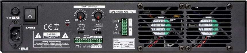 Leistungsverstärker mit zwei unabhängigen Verstärkerkanälen, Einschaltstrombegrenzung und Softstart, Ringkern-Netztrafo sowie zwei eingebaute Lüfter mit temperaturgesteuerter Drehzahlregelung, integrierte elektronische Schutzschaltung gegen thermische Überlastung, DC Signale, subfrequente Signale, Kurzschluss, offene Ausgänge und HF-Einstrahlung Getrennt rastende Pegelsteller für EingangsVerstärker pro Kanal Getrennte LED-Statusanzeige pro Kanal für CLIP,